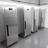 A row of four identical stainless steel refrigerators with digital displays on the doors, each with a black handle and wheels on the bottom. The refrigerators are lined up in a room with a concrete ceiling and a smooth, light-colored floor. | New B Grade Polar G592 Stainless Single Upright Fridge | 5ac3a61244b22c890b5dc8da606f0b06e52a78f2f5563ced114e8e71f1f8d115 | 001401442828 | 0 | 0 | 41 | 9 | 0 | 0 | |
