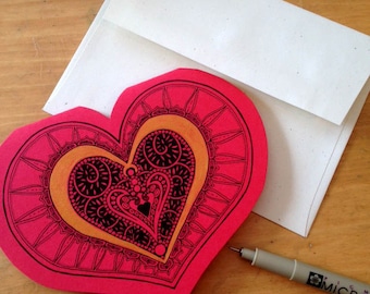 A pink heart-shaped paper with intricate designs is placed on a wooden surface. Next to it, there is a white envelope with a blank interior. A silver pen lies on the surface, partially covering the envelope. | My Fancy Valentine - pen and ink heart-shaped valentine, original artwork, engagement, love, wedding | 9c25e0f6c09c2bbda6d702116bde52ea3b431bf594d91b25ce0ea939293ac2e7 | 001401442903 | 0 | 0 | 36 | 14 | 0 | 0 | |