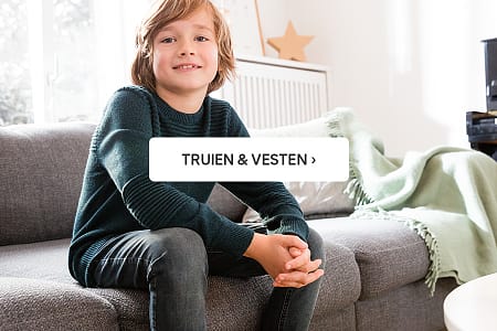 A young boy is sitting on a couch with his hands clasped together. He is wearing a green sweater and blue jeans. In front of him, there is a white rectangular sign with the text 'TRUIEN & VESTEN' in black letters. The background shows a room with a radiator, a star decoration, and a window with daylight coming through. | Jongens\nTruien & sweatshirts | 364f1d4faecad2a7ffa156e3881213711e7cd74793ff500aca86b7b0d5ce75d6 | 001401442810 | 0 | 0 | 59 | 3 | 0 | 0 | |