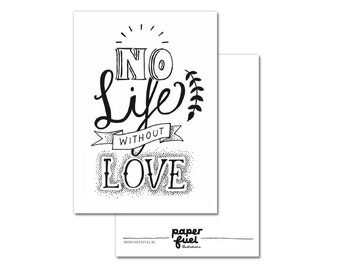 A white card with a black and white illustration of the phrase 'No Life Without Love' in a decorative font, surrounded by a border of leaves. The card is placed on top of a white background with a paper label at the bottom right corner that reads 'Paperfliel'. | Postcard A6 // No life without love | 0731f956c9fdac956ec66bc0fdc3cec86ef7e7dafb1882f7ec084f4aafc7840b | 001401443609 | 0 | 0 | 48 | 7 | 0 | 0 | |
