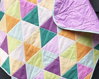 A colorful quilt with a geometric pattern is hanging on a wall. The quilt features a variety of colors including purple, pink, yellow, green, and blue, arranged in a patchwork design with each patch having a different color. The quilt is made up of squares and triangles, creating a vibrant and playful appearance. | SALE triangle baby GEOMETRIC quilt blanket plum by PETUNIAS crib nursery decor baby shower newborn photo prop hipster modern chevron gray | 15bd0ba073b73451870cbb7996bcea47dccc96324e40014f48672c327f34d4a4 | 001401443889 | 0 | 0 | 53 | 21 | 0 | 0 | |