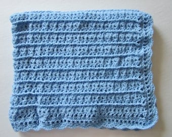 A blue crochet piece with a textured pattern is laid out on a white surface. The piece has a folded edge on the left side and a straight edge on the right side. The texture consists of rows of stitches that create a grid-like pattern. | Crocheted Baby Blanket, Blue, Boy Afghan, Baby Shower Gift | fb0c18704702391fcfeb011de29a10af6924356e162498d84fe70cb2a69c9d8e | 001401443755 | 0 | 0 | 45 | 9 | 0 | 0 | |