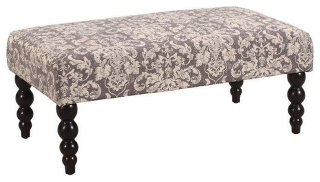 A black and white patterned ottoman with four curved legs is displayed against a white background. | Atlin Designs Bedroom Bench, Gray Damask. | d1e30f83459d3604f9dd0e65dd0149d23f6cb3633064d95b7f55d7a65958c647 | 001401443884 | 0 | 0 | 16 | 6 | 0 | 0 | |