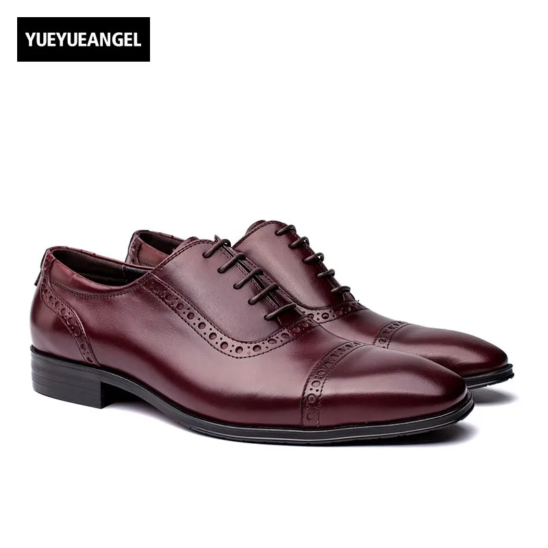A pair of brown leather dress shoes with a lace-up front and perforations on the toe cap. The shoes have a sleek design with a low heel and are displayed against a white background. The brand name 'YUEYUANGEL' is visible in the top left corner. | New Hot Sale Fashion Men Dress Shoes Pointed Toe Genuine Leather For Men Comfortable Breathable Wedding Shoes Lace Up Red Black pointed toe lace up men luxury genuine leather red wedding shoes men s high heels party dress shoes print flowers fashion shoes | 92d3c7a3dc3ed46f8d962cb75ce9d1568c1554940a27bf849c1cf7d82ba8afef | 001401443927 | 0 | 0 | 45 | 43 | 0 | 0 | |