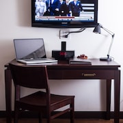 A modern workspace with a wooden desk featuring a laptop, a desktop computer monitor, a desk lamp, a clock, and various desk accessories. A brown leather chair is positioned in front of the desk. The room has a neutral color palette with a focus on wood tones and a large window allowing natural light to enter. | In-Room Business Center | d2283bb8329d4eec0921aa3319d9faaa3ce175a57dcca20041bcf7c60a226df9 | 001401444015 | 0 | 0 | 56 | 3 | 0 | 0 | |