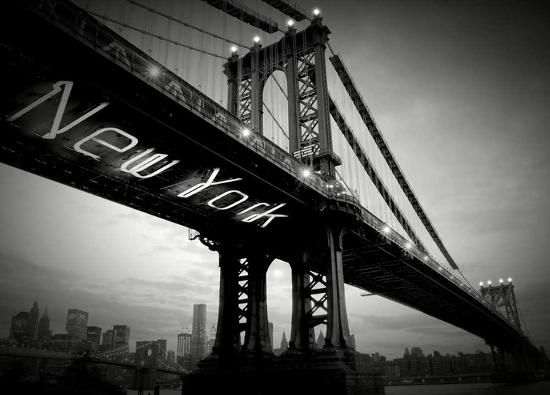 A black and white photograph of the Brooklyn Bridge with the word 'New York' spelled out in bright neon lights on the bridge's cables. The city skyline is visible in the background, and the sky is overcast. | New York Bridge-Blonde Attitude-Art Print | aff8f42202dbc337a331576876e1e41dac4d5803d7ded8b840c9d82e0c71287f | 001401444097 | 0 | 0 | 37 | 5 | 0 | 0 | |