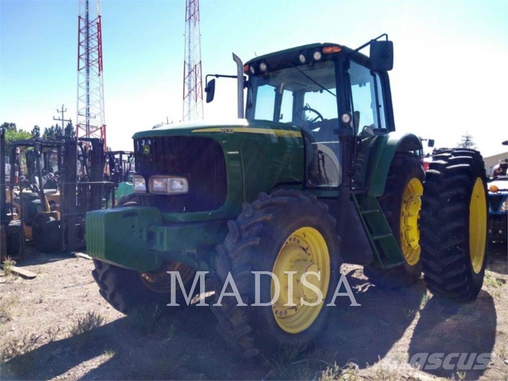 A green tractor with yellow tires is parked on a dirt field with a clear blue sky above. The tractor has a black front grille and headlights, and the word 'MADISA' is written on the ground in front of it. There are several antennas in the background, and the scene appears to be a rural setting. | John Deere 7520 | 6a05f23d2afb31835f2b0672e2456a67e07cc9007e17765ed6a35b711c9defa0 | 001401444055 | 0 | 0 | 56 | 3 | 0 | 0 | |