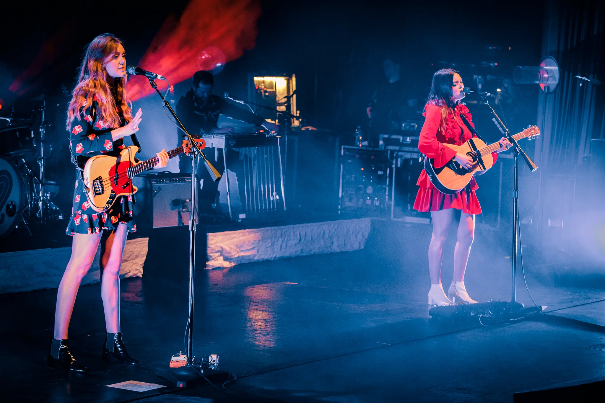 The first image depicts a concert scene with two female musicians on stage. The woman on the left is singing into a microphone, wearing a patterned dress and black boots. She is holding a guitar and has a microphone stand in front of her. The woman on the right is also singing into a microphone, wearing a red dress and... | First Aid Kit performing at the Lincoln Theatre in Washington, DC - 2/9/2018 (photo by Matt Condon / @arcane93) | cb3f13146c961b6573d0aa05fe326974d70b0d4bfe08068c75286103357ca3b5 | 001401444489 | 0 | 0 | 104 | 19 | 0 | 0 | |