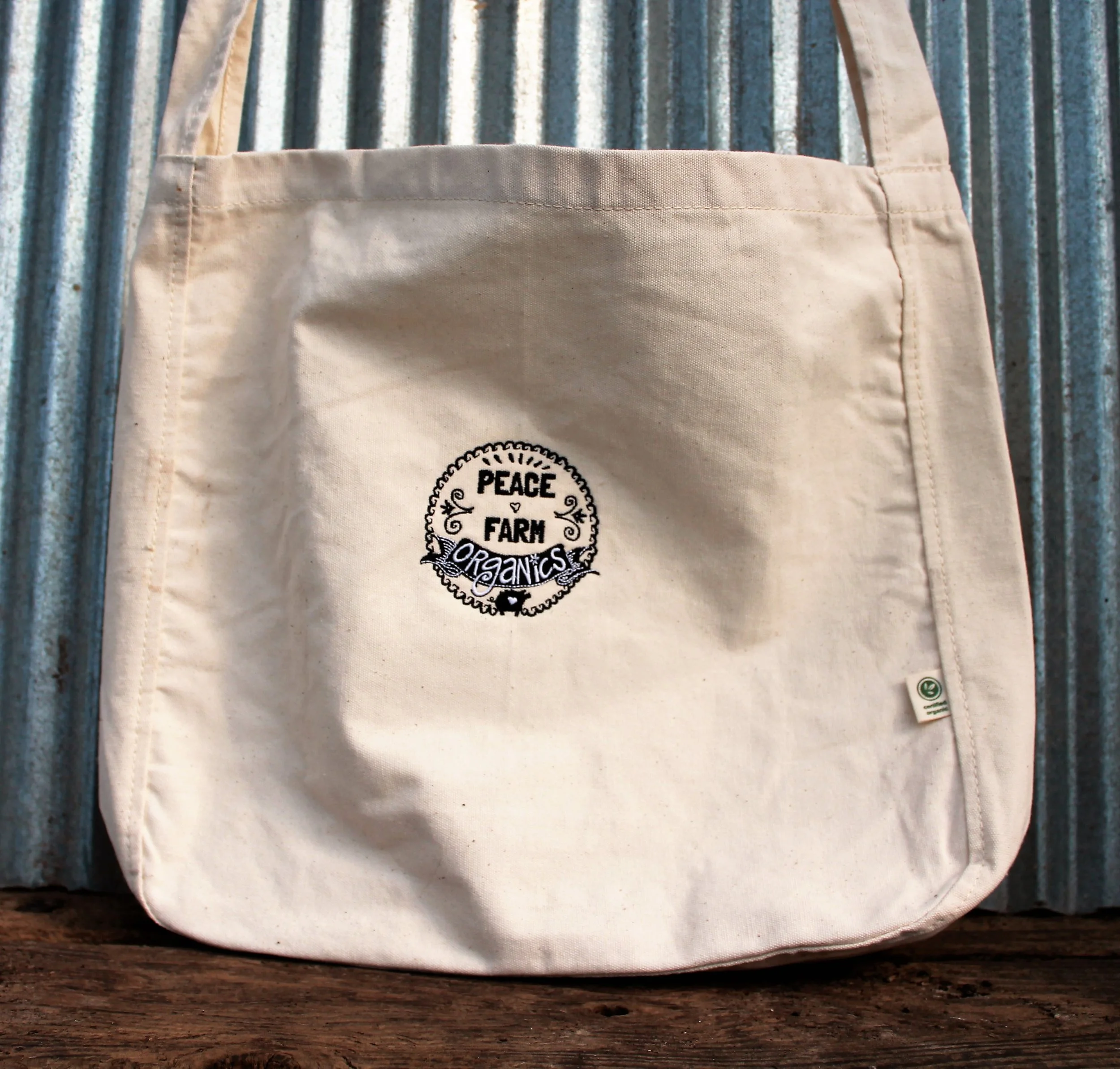 A white canvas tote bag with a circular logo in the center that reads 'Peace Farm' in a decorative font. The logo features a stylized image of a farm with a barn, trees, and a sun. The bag is placed on a wooden surface with a corrugated metal background. | Organic Tote - $29.99 | 794bedaa9334edcfa35c58a21d78b95525fc13f2c928a9c225637d776cc45d87 | 001401444515 | 0 | 0 | 49 | 4 | 0 | 0 | |