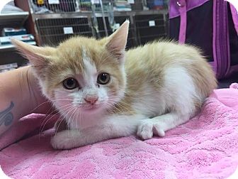 A small orange and white kitten with large eyes and fluffy ears is sitting on a pink blanket. The kitten appears to be looking directly at the camera with a curious expression. In the background, there is a person's arm and a purple bag, suggesting a cozy indoor setting. | Domestic Shorthair Kitten for adoption in Elgin, Illinois - Latte | 96ab582b6fbbdc66b70e6fa8bf2de66c7d369f16868244c31525197c1ad3ee0e | 001401444550 | 0 | 0 | 49 | 10 | 0 | 0 | |