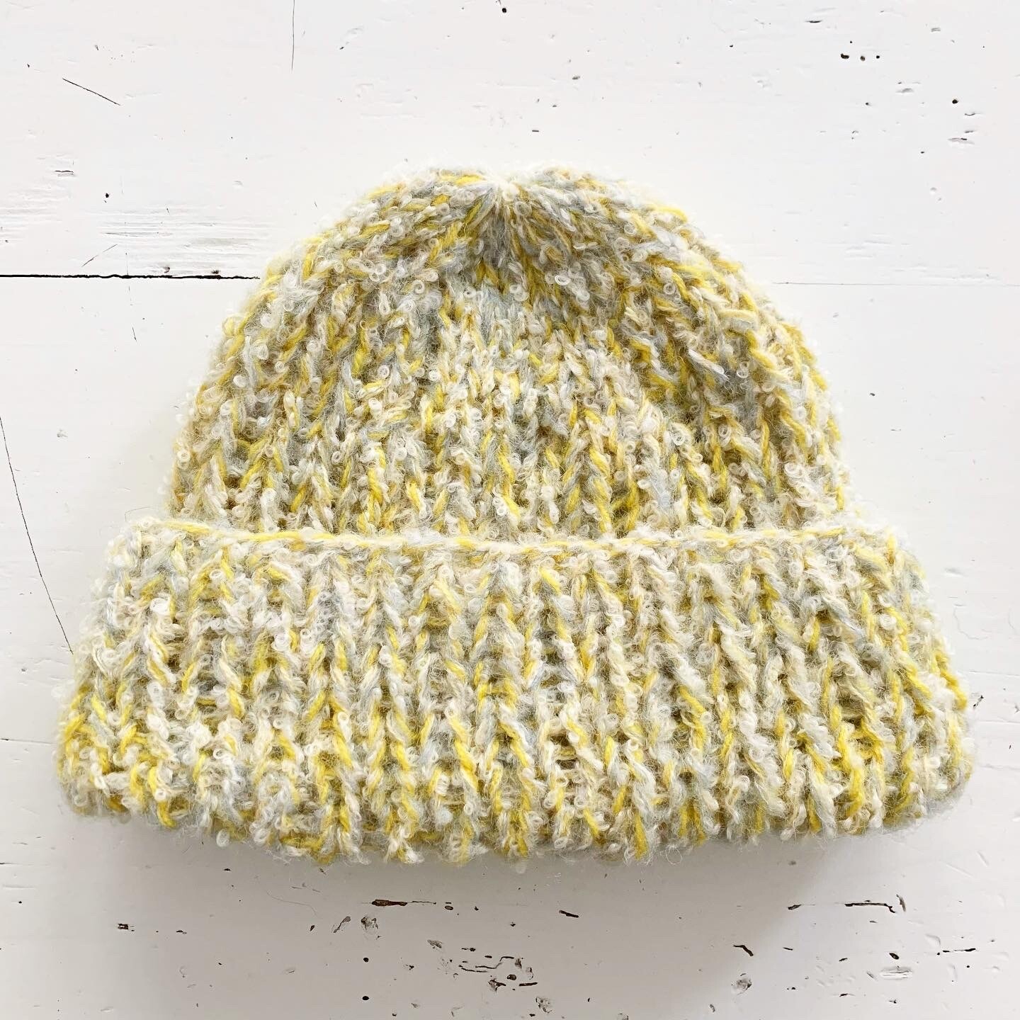 A knitted beanie with a textured surface and a ribbed cuff is placed on a white surface. The beanie has a rounded shape with a slightly pointed top and a loose, slouchy fit. The color is a mix of yellow and white, creating a gradient effect. | Yellow and White Alpaca Hat | edb1af2c3b032e4d1c6806b3ddcfe2bb9e7a21761b0eb6f596423b12a3111328 | 001401444965 | 0 | 0 | 46 | 5 | 0 | 0 | |