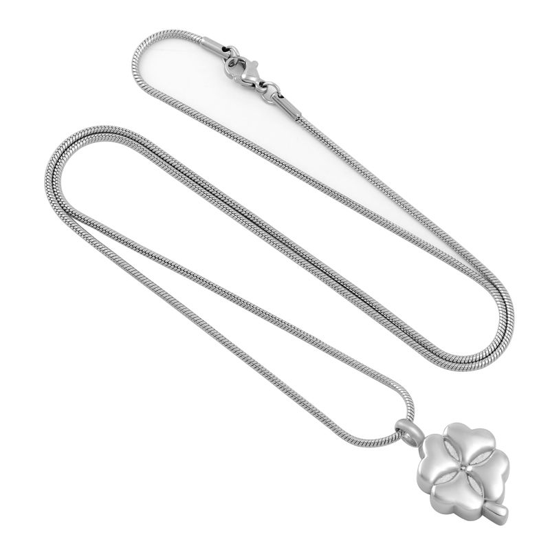 A silver necklace with a silver pendant featuring a silver flower design is displayed against a white background. | DJX9557 Silver Tone 316L Stainless Steel Four Leaf Clover Cremation Jewelry Necklace To Hold Human Keepsake Ashes Urn Pendant | 95a2ebc6af64aca0b542bcad8a4c1ee3ee5132ab5fd3d5de6ff1f4f99e02db2f | 001401444985 | 0 | 0 | 18 | 19 | 0 | 0 | |