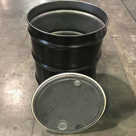 A black metal bucket with a smooth surface and a small metal lid is placed on a concrete floor. The bucket is positioned to the left of the lid, and both items cast a shadow to the right. | Picture of 55 Gallon Open Head Unlined Reconditioned Steel Drum with 2" and 3/4" Fittings | 72147a10c132914d45fa2080c4faf188c49fb0dd578f4b787075e17a8766d046 | 001401444879 | 0 | 0 | 38 | 15 | 0 | 0 | |