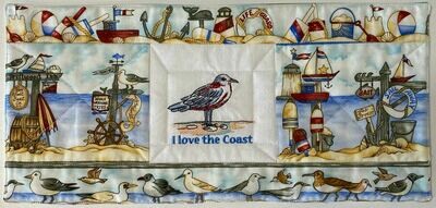 A detailed illustration of a beach scene with various elements such as seagulls, a lighthouse, a sailboat, and a beach ball. The image is framed by a decorative border featuring flags, a bird, and other coastal-themed motifs. | Coastal Mug Rug | d14cc2b64d688cdfca80df8a16291f1d2f2f4ac65400ac76c9ce321299e232a8 | 001401445446 | 0 | 0 | 37 | 3 | 0 | 0 | |