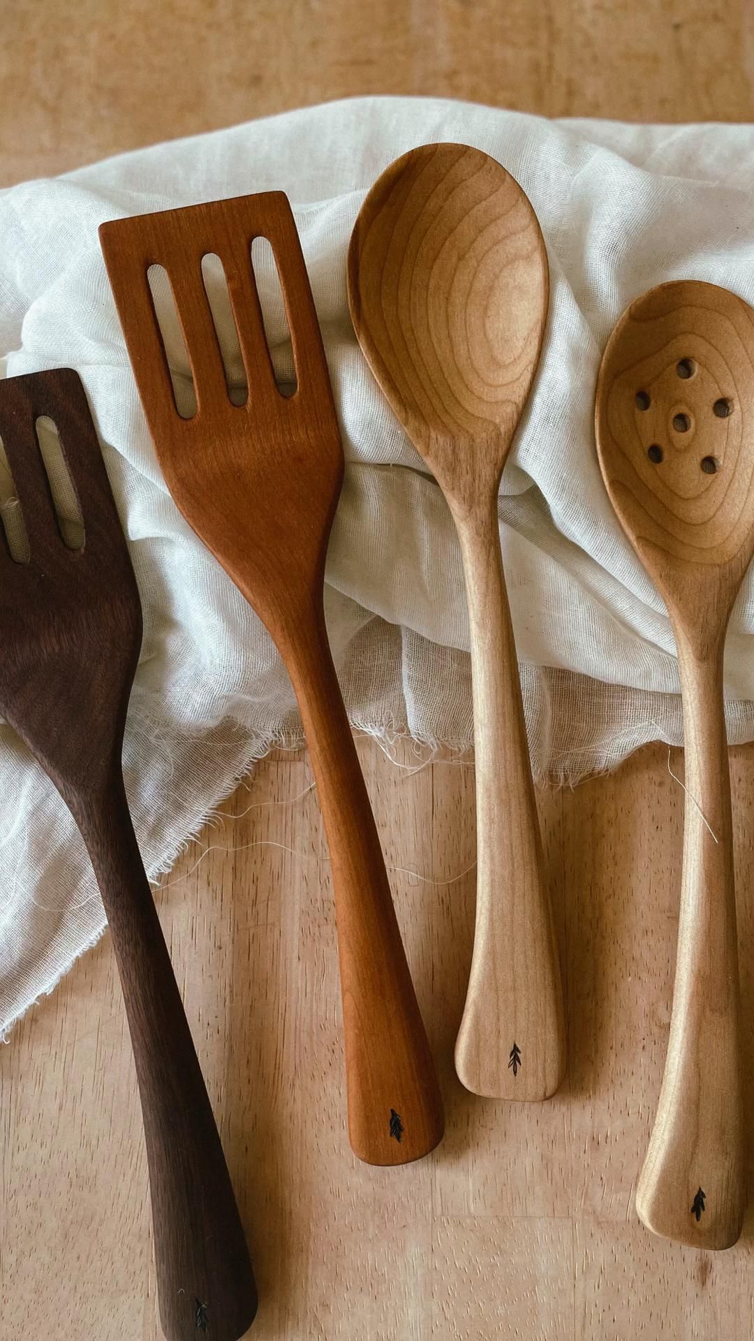 A set of four wooden kitchen utensils, including a spatula, spoon, and two spoons, are neatly arranged on a white cloth placed on a wooden surface. | Grace + Grain Wood Studio Kitchen Utensils | 8e3098456922ac617463315713a4050a960d478665fa44b7dc8f4b4c1d146c73 | 001401445441 | 0 | 0 | 26 | 7 | 0 | 0 | |