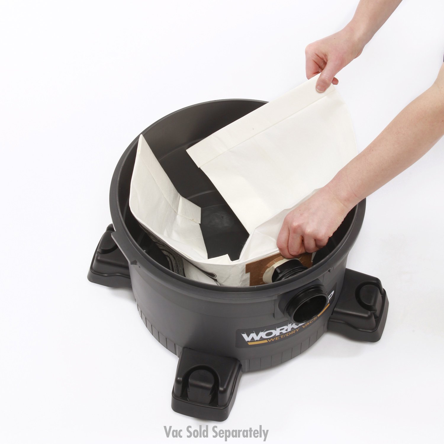 A person is holding a white plastic bag with their right hand, placing it into a black vacuum cleaner container. The vacuum cleaner is on a white surface, and there is a black and white sticker on the bottom right corner of the image. | WORKSHOP Wet Dry Vacuum Bags WS32090F2 Fine Dust Collection Shop Vacuum Bags (2-Pack / 4 Shop Vacuum Bags), Bag Filter For WORKSHOP 5-Gallon To 9-Gallon Shop Vacuum Cleaners by WORKSHOP Wet/Dry Vacs (Image #2) | 04e5ce28ff059e46b5bf4ee0f73b0448ddb89e7890881960c359f9fb76d3b257 | 001401445338 | 0 | 0 | 44 | 34 | 0 | 0 | |
