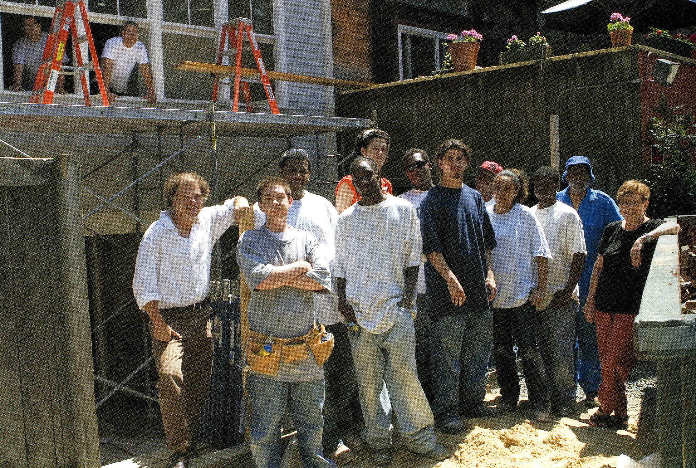 A group of construction workers posing for a photo in front of a building. They are standing on a wooden platform with a ladder leaning against the building. The workers are wearing various clothing items, including shirts, jeans, and tool belts. Some are wearing hats, and there are potted plants on the platform. The b... | YouthBuild kids | c0d3de63547dc0f87653ad40c4df268d99183019200f8af0f94a40a5975dff8b | 001401445363 | 0 | 0 | 74 | 2 | 0 | 0 | |