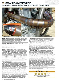 The first image is a magazine article titled 'MXA Team Tested' with a focus on a motorcycle exhaust system. The article includes a detailed description of the exhaust system, its features, and a comparison with other similar products. The article is accompanied by a star rating system, indicating the reviewer's opinion... | Scalvini Pipes USA - Magazine Tests For Handcrafted Motorcycle Pipes | 3ebdc04cf17d0659367bfb117125c777abfa4e0a3a2b1afbc044ef7065063b10 | 001401445415 | 0 | 0 | 73 | 10 | 0 | 0 | |