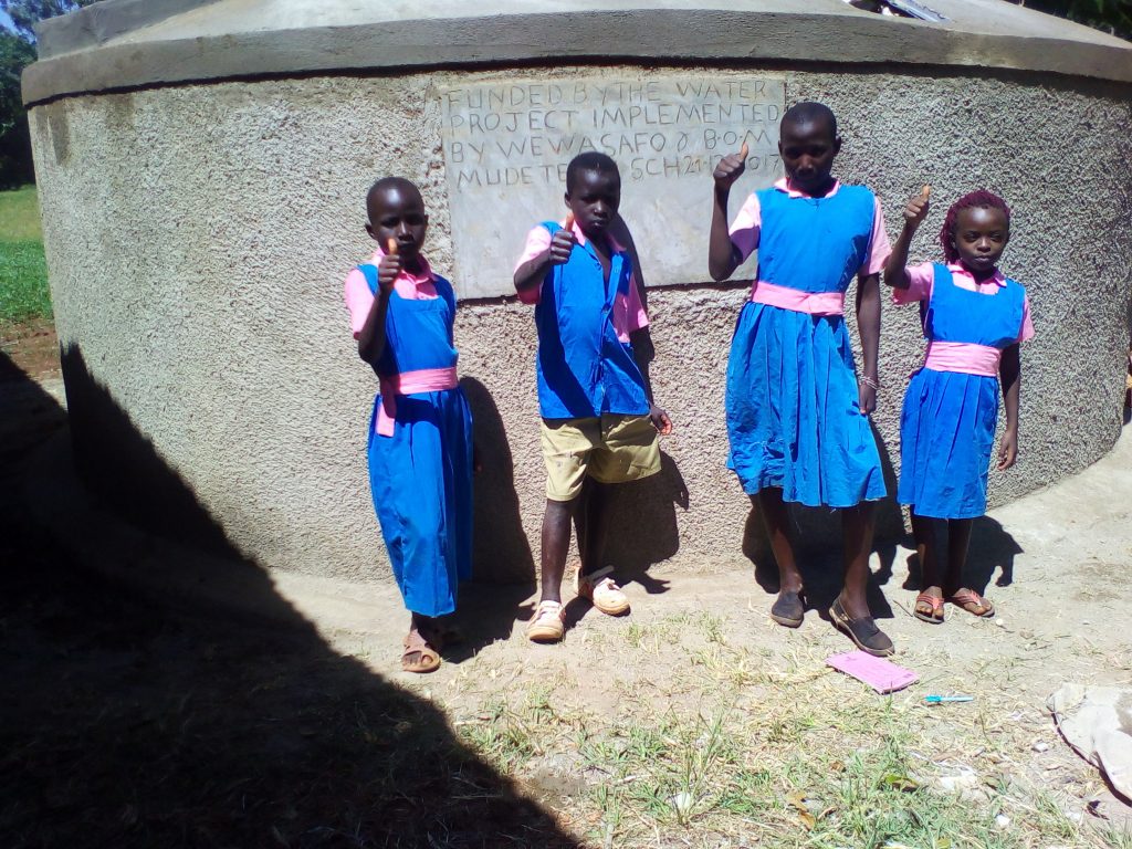 A group of children wearing blue school uniforms with pink ribbons stand in front of a stone structure with a plaque that reads 'Funded by Project Implementer'. The children are posing for a photo, and there is a piece of paper on the ground near the rightmost child. | The Water Project : 23-kenya4840-clean-water | 388071b3ac8f6918becd3d6157687a80e88784fe7a066dba47423cb3d7040627 | 001401445434 | 0 | 0 | 48 | 5 | 0 | 0 | |
