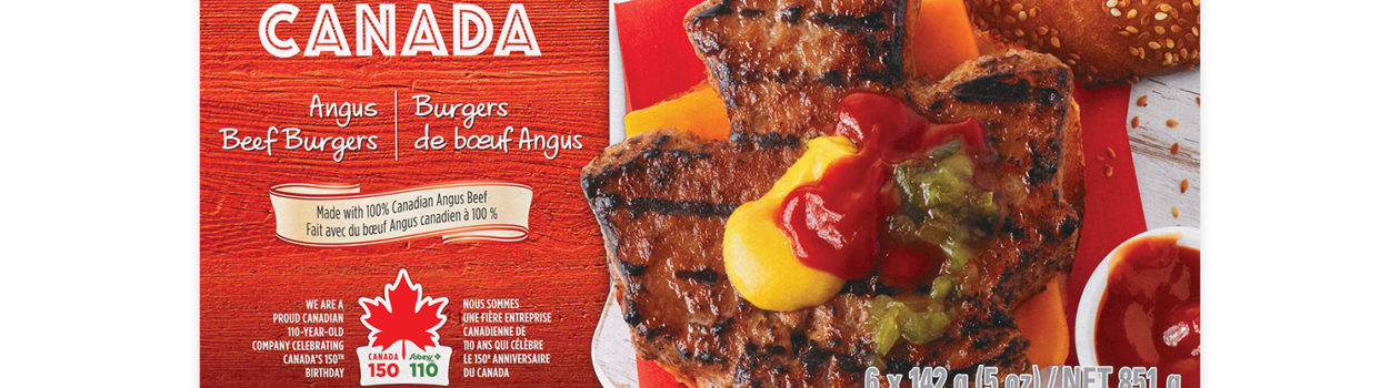 A box of Canadian beef burgers with a red and white color scheme, featuring a stylized image of a burger with a slice of cheese and a dollop of ketchup on top. The box has a Canadian flag in the corner and the words 'Canada' and 'Beef Burgers' prominently displayed. The background is a red and white checkered pattern. | Sensations by Compliments Celebrate Canada Angus Beef Burgers | ff5dc19e7c578d48492a82342eaece5fc71c66518ece1c63811abfe43f57b09f | 001401445443 | 0 | 0 | 59 | 8 | 0 | 0 | |