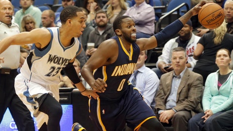 A basketball player in a blue and white uniform with the number 23 is dribbling the ball on the court, with another player in a blue and orange uniform with the number 0 trying to block him. The crowd is watching the game intently, and there are several people in the background, including a referee and other players. | Pacers at Wolves: 10/21/14 | 5d453d0dd6b656e3cb7c40c73f65aa6009586d6ddb5540097f38fb0df7a570d0 | 001401446116 | 0 | 0 | 58 | 4 | 0 | 0 | |
