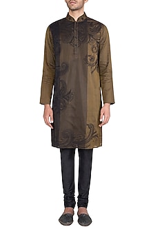 A man is wearing a brown and beige traditional Indian kurta with intricate patterns and a matching pair of black pants. He is also wearing a pair of grey sandals. | Gold Block Printed Embroidered Kurta With Churidaar Pants by Krishna Mehta Men | 4f1349cac91af797699260a0c258a2da984581867b7977d99f1de706eb256dd4 | 001401446186 | 0 | 0 | 30 | 12 | 0 | 0 | |