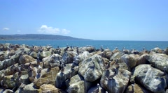 A rocky coastline with a clear blue sky above. The rocks are covered in white and gray lichen, and there are several seagulls perched on the rocks. The ocean is calm with gentle waves lapping against the shore. | Drone view of pelicans on rocks by ocean and blue sky Stock Footage | f536ae1158e560ae216bc99b22449b6548eb6536da72a8a9a0787687f2bb05f9 | 001401446251 | 0 | 0 | 38 | 13 | 0 | 0 | |