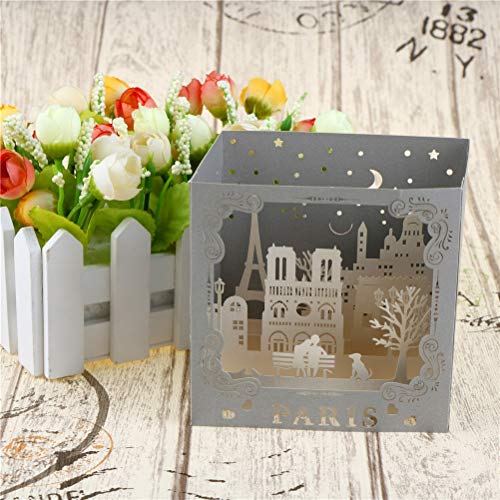 A silver metallic card with a Paris-themed design is placed on a wooden surface. The card features an embossed image of the Eiffel Tower, a street scene with buildings, and a tree. The background of the card has a night sky with stars and a crescent moon. The card is surrounded by a white flower arrangement in a white ... | Cards & Invitations - Famous City Night View Paris Postcards 3d Pop Up Handmade Vintage Greeting Love Cards Scratch Paper - Birthday Up Rainbow Up Amigurumi 3d Tower Paint Vintage Child Vinta - | 982c2f5163c10c942f140eab8ed0dab09560c38308d45b52d30e8f2003695782 | 001401446276 | 0 | 0 | 60 | 33 | 0 | 0 | |