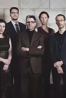 A group of five people is standing in a row, posing for a photo. From left to right, there is a woman wearing a black dress with a geometric pattern, a man in a dark suit with a tie, a man in a brown suit with a black shirt, a woman in a purple dress, and a man in a dark suit with a black shirt. They are all wearing gl... | New York's avant-garde Wet Ink Ensemble to perform at Stetson University in April | 19067274115dcc118c263c943657b41810eb336a60cb6e1b6919e10b5a18f93f | 001401446279 | 0 | 0 | 82 | 13 | 0 | 0 | |