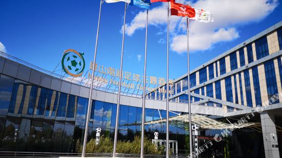 A modern glass building with a curved design and a large green logo on the side. The building has a series of flags flying on poles in front of it, and the sky is clear with a few clouds. The building's reflection can be seen in the glass facade. | Nanhu Football Theme Hotel | 25f4238fc8596f786b7f2010811faa5011da7a33dd43d2910f464c054bbd9587 | 001401446401 | 0 | 0 | 49 | 4 | 0 | 0 | |