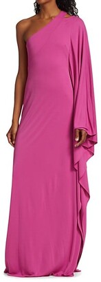 A woman wearing a pink dress with a flowing design and a draped sleeve. | Halston Lydia One-Shoulder Gown | 587f8c2494f9490031358c9866ccbacdf44d59e2b286755ef520bbafec35e97e | 001401446516 | 0 | 0 | 14 | 4 | 0 | 0 | |