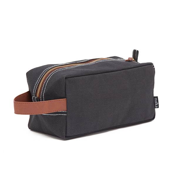 A black canvas bag with a brown leather trim and a zipper closure is displayed against a white background. The bag has a rectangular shape with a flat bottom and a slightly curved top. It features a brown leather handle on the top left side and a brown leather patch on the bottom right corner. The zipper is brown and r... | Maika Goods Reclaimed Cotton Canvas Dopp/Travel Case | 2fe922eb8c67cb67770e3531b4c1d060084dc0de657e91a602694d723bb3196c | 001401446657 | 0 | 0 | 73 | 7 | 0 | 0 | |