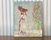 A painting of a woman in a white dress and a large hat, standing next to a table with a vase of flowers, is displayed on a wall with blue and white striped wallpaper. | Lady Rose Dollhouse Miniature Painting A Day At The Races fashion | d8fc2b8a7584a9a39435063a0f676933b0d287690df7135dc0d84e5c14617a02 | 001401446691 | 0 | 0 | 34 | 11 | 0 | 0 | |