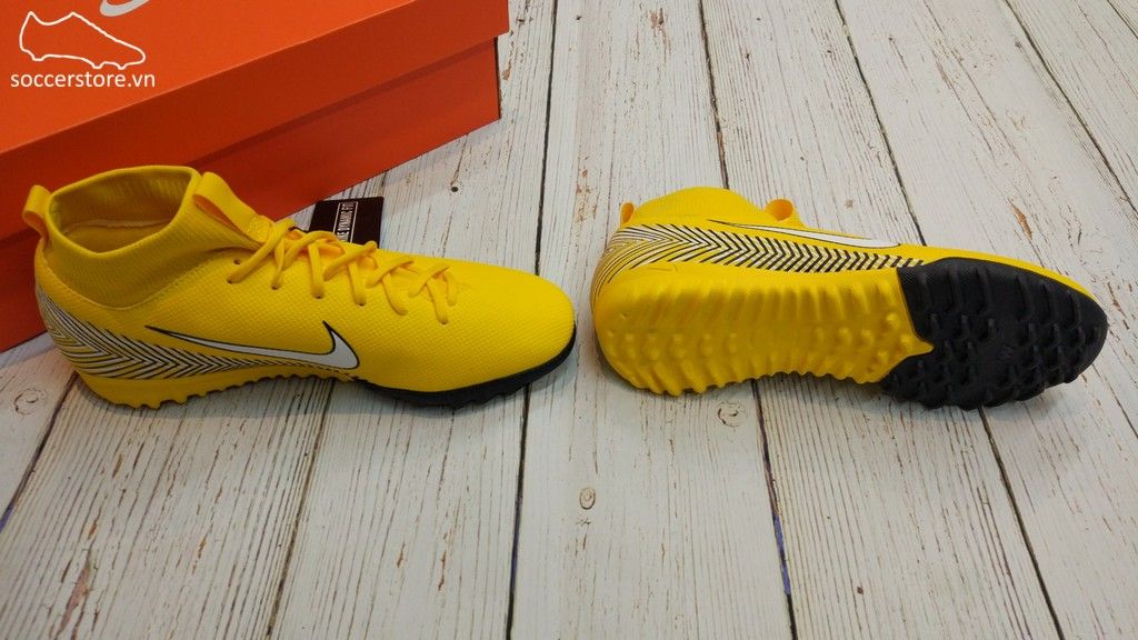 A pair of yellow and black Nike cleats with white laces are placed on a white wooden floor. The shoes are positioned with one shoe facing forward and the other shoe facing backward. The shoes are next to an orange box with the word'soccer' written on it. | Nike Mercurial Superfly VI Academy Neymar Kids TF- Amarillo/ White/ Black AO2887-710 | 4a84031bcf7490de8e2e75f2490aa51eab5ba60246ad748060e300e175005668 | 001401446731 | 0 | 0 | 47 | 12 | 0 | 0 | |