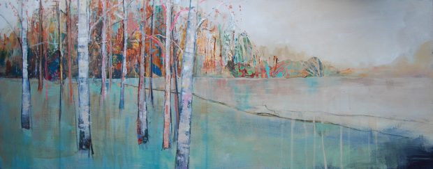 A painting of a serene lake with a forest in the background, featuring a variety of trees with colorful foliage. The lake is depicted with a gradient of colors, ranging from light blue at the top to darker shades near the bottom. The painting has a textured appearance, with visible brush strokes and a sense of depth cr... | 'Quiet Autumn Morning' Anna Perlin Mixed media, 40cmx100cm, 2016 | 5147ecdf006914f9cd908bdd66387e8aa59403cbc6fc185d7aa2d2c87ee93344 | 001401446649 | 0 | 0 | 63 | 9 | 0 | 0 | |