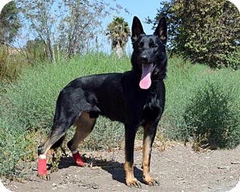 A black German Shepherd dog with a pink tongue sticking out is standing on a dirt path surrounded by green grass and bushes. The dog has a red bandage on its front left paw. | German Shepherd Dog Dog for adoption in San Diego, California - Tim | c2aed2f0c23f844d076d0b36ddd6614e0ec51d4a497c6f0d70e1d2a6d2f07908 | 001401447008 | 0 | 0 | 34 | 12 | 0 | 0 | |