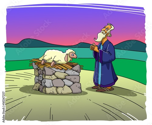 A cartoon image of a shepherd in a blue robe standing next to a stone wall with a lamb on top. The shepherd is gesturing with his right hand. The background features a sunset with purple and orange hues, and there are mountains in the distance. The sky has a gradient from purple to orange, and there are no birds presen... | Abraham brings a lamb sacrifice Wall mural | bca90cf65fb101b0929caa0823df52a3f365b1b2bd243e82c76f5e384ea40ca2 | 001401447962 | 0 | 0 | 61 | 7 | 0 | 0 | |