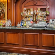 A well-stocked bar with a variety of bottles and glasses. The bar has a wooden counter with a green surface, and there are shelves behind the counter filled with bottles. There are also bottles and glasses on the counter. The bar is set against a wall with a wooden paneling and a decorative archway above it. | Hotel Bar | aa387abb90c083f5311fb37082ccec5c529f2d895f9c64d5fa447acfaf91fc50 | 001401447878 | 0 | 0 | 56 | 2 | 0 | 0 | |