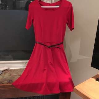 A red dress with a black belt is displayed on a mannequin. The dress has a fitted bodice and a flared skirt. The mannequin is positioned in front of a window with a view of a building outside. The dress is hanging on a wooden hanger, and there is a wooden table with a patterned cloth underneath the mannequin. | Red dress | 4aa332689a7d0d96748a0d912ffa7c1855338c668c2c8c0de50c81685d71f656 | 001401447836 | 0 | 0 | 59 | 2 | 0 | 0 | |
