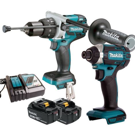 A set of Makita power tools is displayed on a white background. The set includes a drill with a black and teal color scheme, a drill bit, a battery pack, and a charger. The drill has a drill bit attached to it, and the battery pack is placed on a stand with a yellow and black label. The charger is also on a stand with ... | Makita 18V Combi Drill + Impact Driver with 2 x 4.0Ah Batteries & Charger | 5f4d5ce8f69d522ae6eeabc5b71f44ddd169aeb399ef5046999ae6f7a26d0ee2 | 001401448013 | 0 | 0 | 70 | 14 | 0 | 0 | |