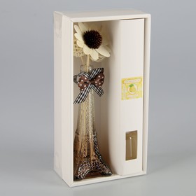 A white box with a clear plastic window displays a bouquet of dried flowers, including a prominent sunflower with a dark center and a smaller flower with a similar appearance. The bouquet is adorned with a brown bow and is placed on a textured surface. The box has a gold label with a green apple icon and the text 'APPL... | Gift set "Eiffel tower" (vase, 2 sticks with beads, decor, essential oils 30 ml), fragrance lemon | cce59ddef5437c4e831275266557372949586dc83d3d6e936bb7deb6400f999d | 001401448049 | 0 | 0 | 77 | 16 | 0 | 0 | |
