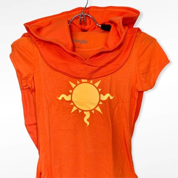 A bright orange t-shirt with a large yellow sun graphic on the front is displayed on a hanger. The t-shirt has a round neckline and short sleeves. The sun graphic is centered on the chest area and has a stylized appearance with rays emanating from the sun. The t-shirt is shown against a white background. | Homestuck Womens T Shirt Hood Vriska Serket God Tier Cosplay Costume Orange XS | 9c7f28a5a8863f48030236126966d4966f9b6695844b9cef962d60f74921ea82 | 001401448347 | 0 | 0 | 55 | 13 | 0 | 0 | |