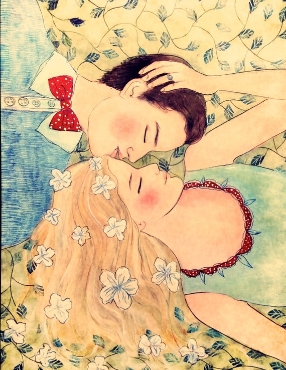 A watercolor painting of a man and a woman lying down, with the man on the left and the woman on the right. The man is wearing a blue shirt with a red bow tie and is resting his hand on the woman's shoulder. The woman is wearing a green dress with a red floral pattern and is lying on her back with her eyes closed. Both... | Lovers dreaming on the grass | b2d1ec04ab3aa34288d905361bd7de06b989fd6ccbf60505908a9cabc1892bae | 001401448263 | 0 | 0 | 77 | 5 | 0 | 0 | |