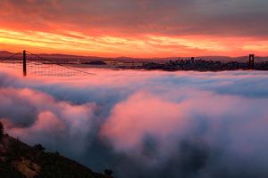A dramatic view of the Golden Gate Bridge shrouded in a thick layer of fog, with the city skyline barely visible in the background. The sky is painted with hues of pink and orange, suggesting either sunrise or sunset. The fog creates a mystical atmosphere, obscuring the details of the bridge and the city. | Sunrise Magic Fog Light at San Francisco Bay Dramatic Vision by Vincent James | 8446bedf8062f35ec9fde21a6eb15e3076f431497be5cdef54d33d92dcb8476e | 001401449275 | 0 | 0 | 54 | 13 | 0 | 0 | |