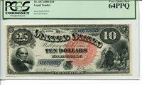 A close-up view of a green certificate with a large, ornate seal in the center featuring the words 'UNITED STATES' and 'TEN DOLLARS'. The certificate has a portrait of a man on the left side, possibly a historical figure, and a vignette of a group of people on the right side. The certificate is bordered by intricate de... | FR 107 1880 $10 Legal Tender PCGS 64 PPQ Very Choice New | 58c542cebdc917d5ab27bae843289e6774474ab6801b91a884551cbb9e6c8c09 | 001401449432 | 0 | 0 | 69 | 12 | 0 | 0 | |