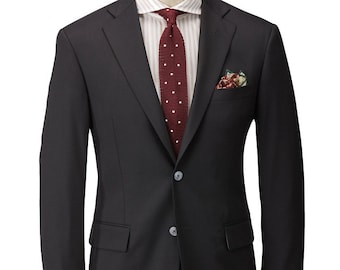 A mannequin is dressed in a dark grey modern business suit with a white shirt and a red and white striped tie. The suit has a lapel and a pocket square with a floral pattern. | Hardwick Modern Fit Black H-Tech Super 110S Wrinkle Resistant Wool Blazer | e3859372910c5e965053841e75bf3ce1dc3b12c6ceb96d35be6429b82be09eff | 001401449444 | 0 | 0 | 35 | 11 | 0 | 0 | |