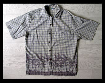 A plain white shirt with a plaid pattern on the front and a tropical leaf design on the left side is laid out on a wooden surface. | Vintage Rip Curl surf shirt, size Large | 73721a1e04a33e1d7b4c3d217719e8f90486e37f6aa51e200ea692f1a972067c | 001401449414 | 0 | 0 | 27 | 7 | 0 | 0 | |