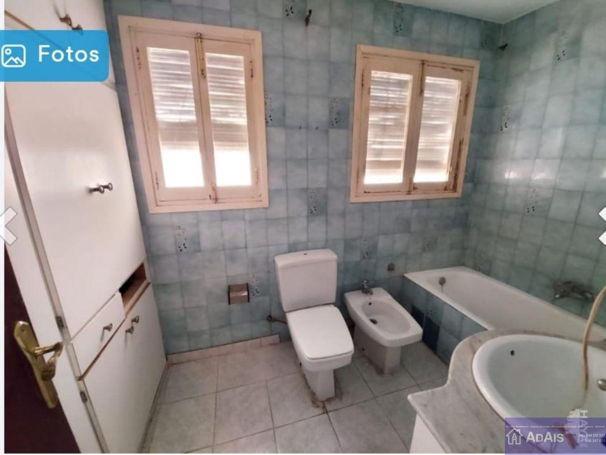 A small, clean bathroom with blue tiled walls and a white toilet. There is a white sink with a chrome faucet, and a window with white blinds. The floor is tiled, and there is a blue sign with a white arrow and the word 'FOTOS' in the top left corner. | For sale of flat in Gandia | c559bdcf23c3b5917fb2d14ad065d4df2f591a8d7477bd745e73003b10a58411 | 001401449464 | 0 | 0 | 50 | 6 | 0 | 0 | |