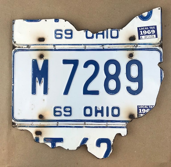 A rusted and damaged Ohio license plate with the numbers 697289 and the letters M and O visible. The plate is mounted on a surface with a map of Ohio in the background. | Ohio 1969 license plate map, License Plate Wall Art , Ohio Wall Decor, Unique gift, mancave, ohio, buckeyes, gift for him | 79100472d6a4a47c034d510afc7061ca33ec6fa3496f000ec96adb80447e055c | 001401450352 | 0 | 0 | 33 | 21 | 0 | 0 | |