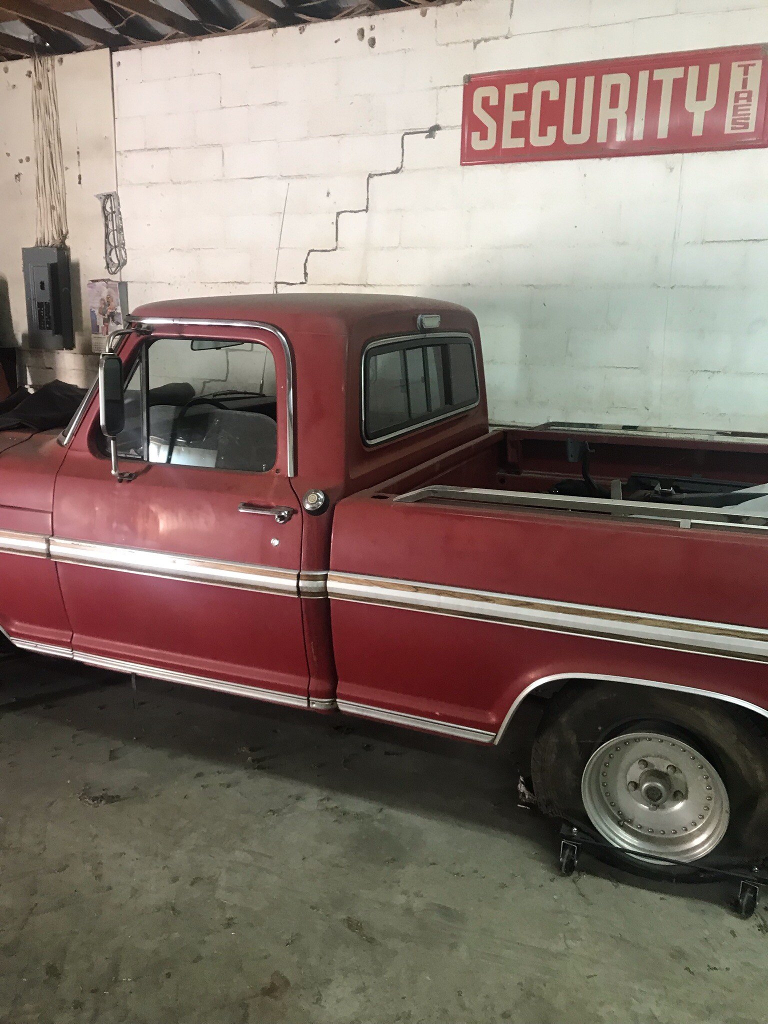 A red pickup truck with a white stripe is parked in a garage. The truck has a flatbed in the back and a window on the driver's side door. The interior of the truck is visible through the window, showing a seat and a steering wheel. The garage has a white wall and a concrete floor. | 1972 Ford F100 2WD Regular Cab for sale 101396021 | a576baed08f5a1bcd1825a8a1e2ebdc78351636dceaac7ef3336cb9809e10ce6 | 001401450908 | 0 | 0 | 56 | 9 | 0 | 0 | |